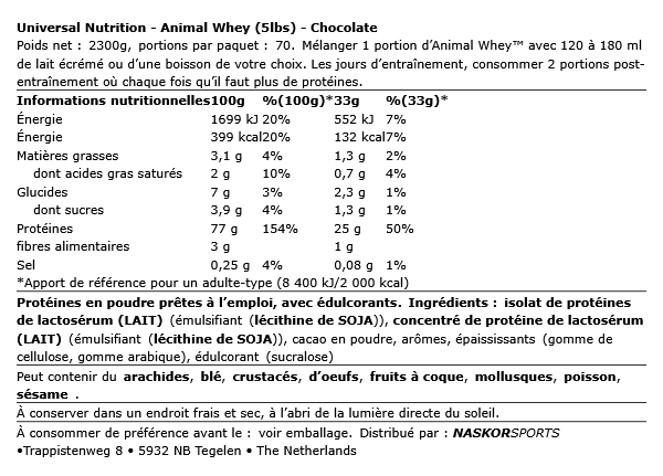 Animal Whey se compose d'isolat et de concentré de protéine de lactosérum filtré. Contient 25g de protéines par portion, ce qui contribue à la croissance et au maintien de la masse musculaire. Ce lactosérum peut être rapidement absorbé par l'organisme pour un apport rapide en protéines approprié.