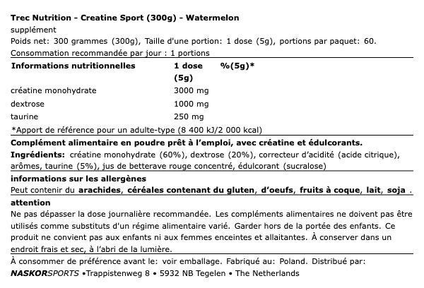La créatine contenue dans Creatine Sport de Trec a été enrichie de dextrose et de taurine. Le dextrose est un sucre simple qui soutient le transport de la créatine vers les muscles et améliore la force, l'endurance et le développement de la masse musculaire, et ajoute l'énergie nécessaire à l'exercice. La taurine est un acide aminé important qui a des effets anti-cataboliques (inhibe la dégradation musculaire) et anabolisants - favorise la croissance musculaire.