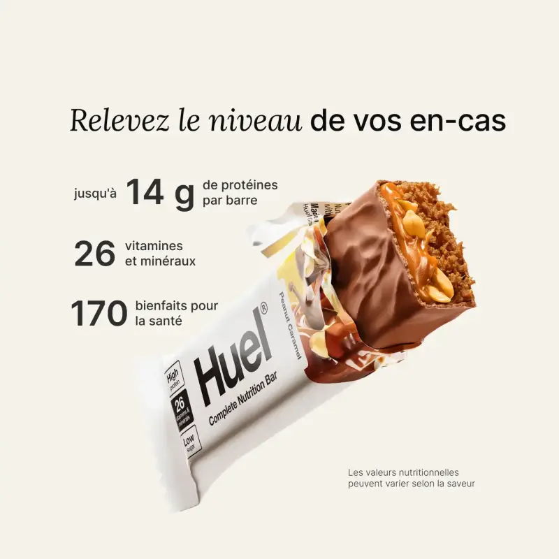 La solution idéale pour un en-cas à emporter: la barre nutritionnelle complète Huel apporte toutes les vitamines et minéraux essentiels, ainsi qu'une quantité importante de protéines, dans un format pratique. Découvrez de délicieuses variétés, riches en saveurs et en nutriments.