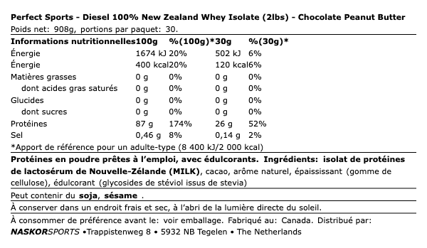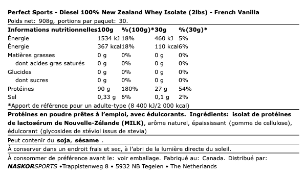 De plus, grâce au procédé de purification avancé utilisé par PERFECT Sports, la quasi-totalité du lactose est éliminée de notre isolat de protéines de lactosérum DIESEL de Nouvelle-Zélande. Ainsi, notre formule DIESEL est extrêmement bien tolérée par les personnes sensibles au lactose.